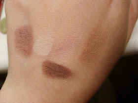 The rosey taupe looks like MAC Rose Gold pigment but in a great formulation. The two deep wine purples are similar but one is matte (like MAC Shadowy Lady) and one is somewhat more pink toned and frosty.